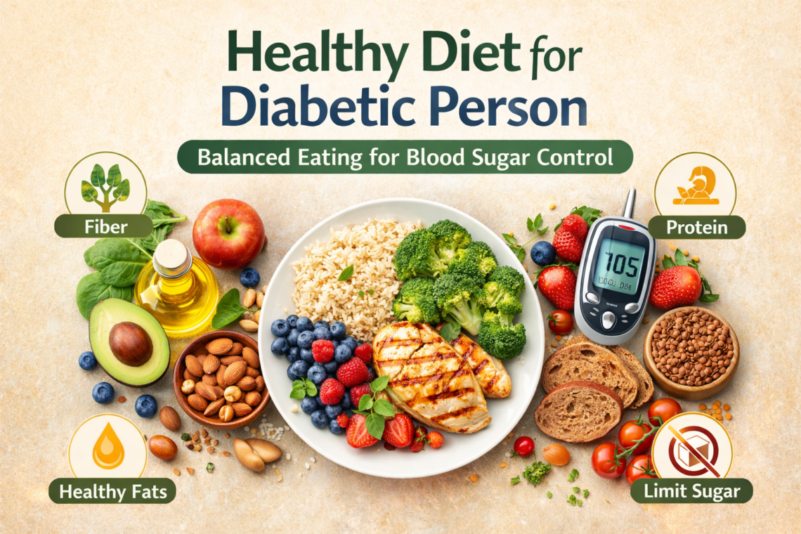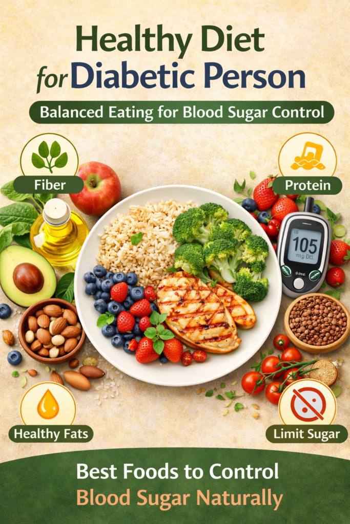 A healthy diet for diabetic person includes high-fiber foods, lean proteins, healthy fats, and low-glycemic carbohydrates. Foods like whole grains, green vegetables, nuts, and fruits help in maintaining stable blood sugar levels.